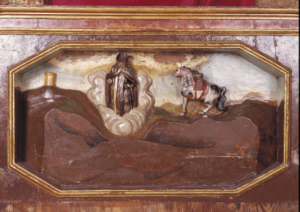 I, encara, Obrador aporta un darrer testimoni, sorprenent, d’aquesta doble devoció popular, que indica fins a quin punt la presència menorquina de Sant Jordi va passar a l’oblit a partir del segle XIX. Es tracta de les restes d’un retaule que es conserva al Museu de Menorca que, originalment, es trobava a l’església de Sant Antoni, a l’actual carrer de s’Arraval. A la predel·la —és a dir, al bancal del retaule— s’hi poden observar dues figures humanes. La primera, malgrat la decapitació, representa Sant Antoni. No sembla haver-hi cap dubte al respecte. La segona, molt més mutilada encara —només en resta el cavall, blanc, la sella i unes brides vermelles— s’havia atribuït al rei Alfons. Obrador, però, apunta en una altra direcció: «la coincidència entre un vell (Sant Antoni) i un cavall blanc fa pensar en la identificació amb Sant Jordi descrita en les fonts de la mitificació bèl·lica o, com a mínim, una certa identificació entre el sant cavaller (i ses virtuts) i el rei cristià». Si hi eren els dos, segons la llegenda, el dia de la batalla, sembla lògic que se’ls representi plegats.